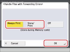 Press → [Function Settings] → [Receive/Forward] → [Common Settings] → [Handle Files with Forwarding Errors] → select [Store/Print] or [Always Print] → press [OK].