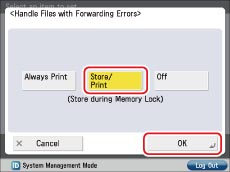 Press → [Function Settings] → [Receive/Forward] → [Common Settings] → [Handle Files with Forwarding Errors] → select [Store/Print] → press [OK].