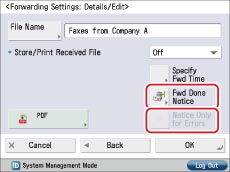 You can set to send e-mail notifications only when a forwarding error occurs. Select a forwarding condition → press [Details/Edit] → select [Fwd Done Notice] and [Notice Only for Errors].