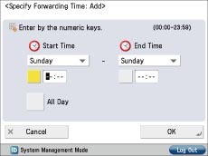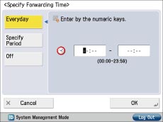 By selecting [Specify Fwd Time], you can set to validate/invalidate forwarding settings based on the day or time. For example, you can set to invalidate forwarding at times when the computer is turned OFF, such as during evening hours and non-working days.