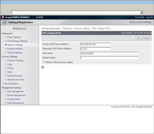 → [Preferences] → [Network] → [TCP/IP Settings] → [DNS Settings].If the continual issuing of packets from the imageRUNNER ADVANCE machineto the DNS server is causing excessive network traffic, you can disable dynamic DNS updating after communication is complete.