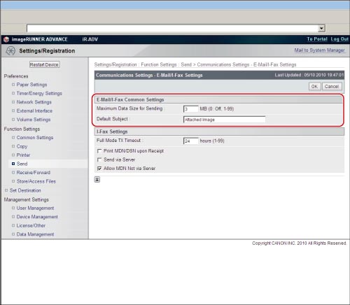 → [Function Settings] → [Send] → [E-Mail/I-Fax Settings] → [Communications Settings]. |