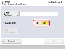 Set the maximum data size for sending lower than the data limit for the mail server. If you enter '0' MB as the data size, there is no size limit on the data that is sent. |
