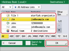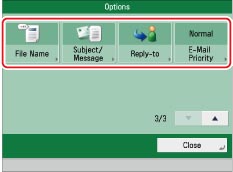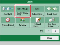 You can only select settings stored in advance for "Sender Name" and "Reply to." You cannot enter a new destination on the Options Screen. Store the destination in Settings/Registration. The "Sender Name" displayed on the reception screen is the unit name set for the imageRUNNER ADVANCE machine that is sending. The "Sender Name" setting is not reflected.