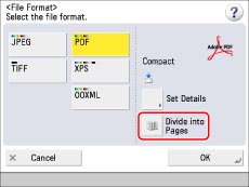If you select [PDF], [XPS], [TIFF], or [OOXML], you can use the Divide into Pages mode.