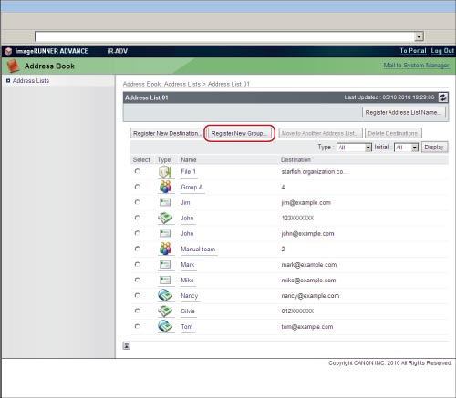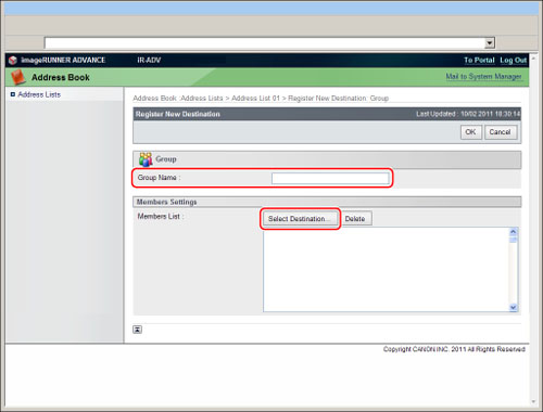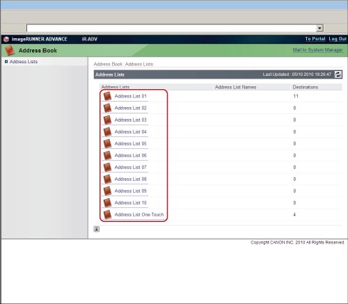 Access the Remote UI → click [Address Book] → select an address list from the Address Lists page.