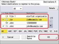Press [Add from Address Book] → select the e-mail addresses that you want to store in the group → press [OK].