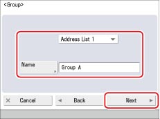 Press [Name] → enter 'Group 1' as the new group name → press [Next].