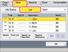 Press [Status Monitor/Cancel] → [Send] → [Log] → check that the e-mail was sent successfully.