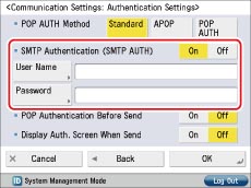 If the environment of the e-mail server requires SMTP authentication, set this setting to 'On' and enter the user name and password.