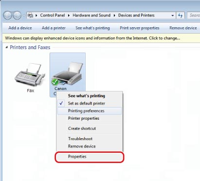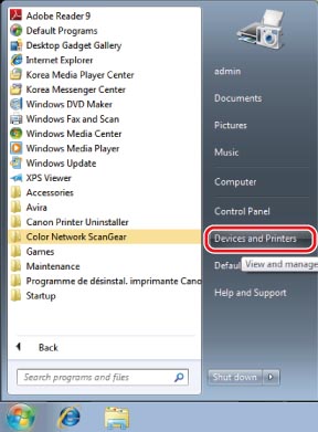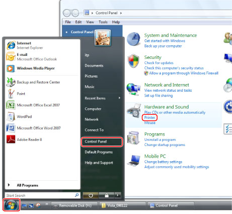 For Windows XP, select [Start] → [Printers and Faxes] (or [Start] → [Control Panel] → [Printers and Other Hardware] → [Printers and Faxes]). For Windows Vista, click [