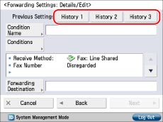 Forwarding settings for received files not stored in memory are not displayed, even if you press a button for <Previous Settings>.