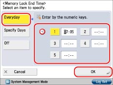 If you select [Off], Memory Lock will not automatically turn on at the specified time. You can manually turn Memory Lock On or Off by pressing [On] or [Off] under <Fax Memory Lock> or <I-Fax Memory Lock> on the Memory RX Inbox screen.