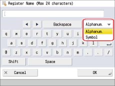 For screens that require alphanumeric entries, enter characters using the keys displayed on the touch panel display, as described below.