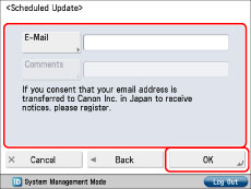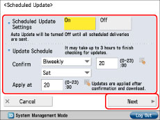 If Scheduled Update is set, a firmware update is applied at the specified time after the new firmware is downloaded from the delivery server. After application is complete, the machine automatically restarts.