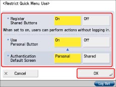If you set <Register Shared Buttons> to [On], general users and unauthorized users can register, edit, or delete the Shared button, or change the size of buttons and the wallpaper image.