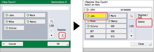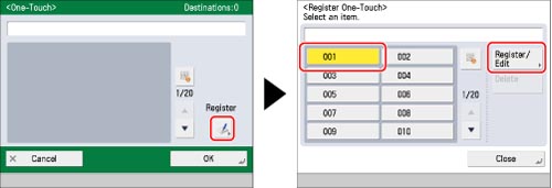 You cannot register new destinations in a group destination that is stored in a one-touch button. The destinations must be registered in the one-touch buttons beforehand.