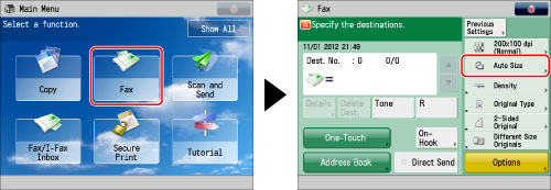 Press [Fax] → specify the desired destinations → press the scan size button.
