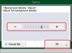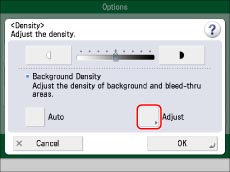 If you adjust the background density by pressing [Adjust] for <Background Density>, the [Auto] setting is cancelled. Similarly, if you press [Auto] while making manual adjustments in [Adjust], your adjustments are cancelled. The machine automatically adjusts the density to match the background.