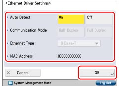 Press [Ethernet Driver Settings] for [Network] → specify the following items → press [OK].