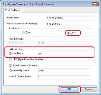 Select [LPR] in [Protocol] → enter the print queue name in [Queue Name] in [LPR Settings] → click [OK].