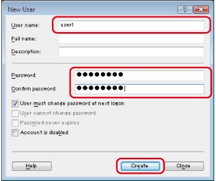 In the [New User] dialog box, enter the user name in [User name] → enter the password in [Password] → re-enter the password in [Confirm Password] → click [Create].
