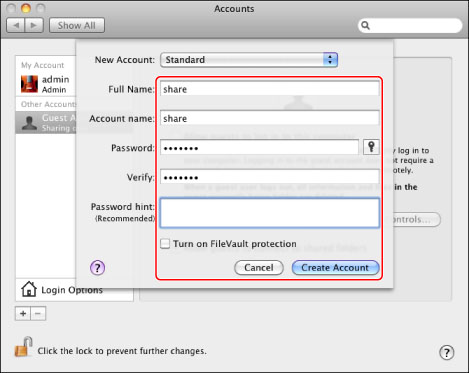 In the [Accounts] window, enter the name of the user to whom you want to send data from the machine through Mac OS X → enter the password.
