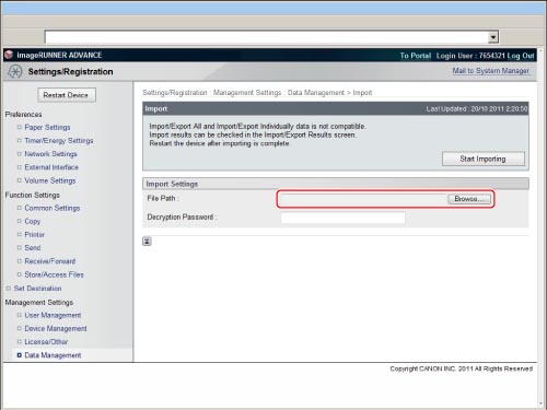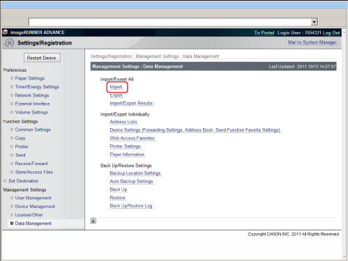 The machine must be restarted to enable the imported settings. After importing, the Remote UI cannot be used to perform other operations until the machine is restarted. Turn OFF the main power of the machine, and turn the main power back ON again. (See "Main Power and Energy Saver Key.")