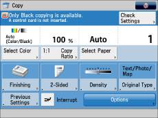 If you set <Allow Black Copy/Print Jobs> to 'On', [Black Copy/Print] appears on the screen for entering the Department ID and PIN and the screen for inserting a control card.