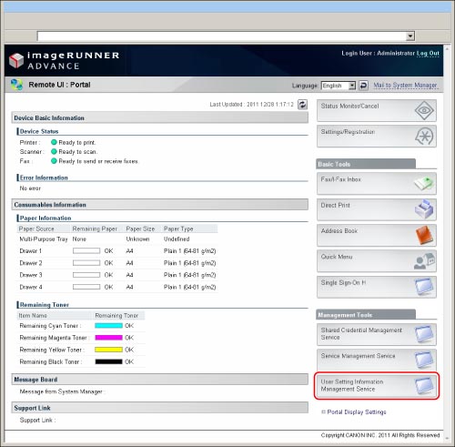 To specify each setting for User Setting Information Management Service, it is necessary to access and then log in to the machine from the Web browser. This section describes the procedure for accessing the machine from the portal page of the Remote UI.