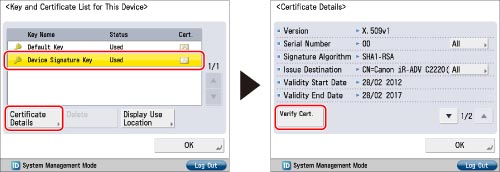 Select "Device Signature Key" → press [Certificate Details] → [Verify Cert.].