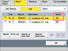 You can confirm the delivery status of the document in [Status Monitor/Cancel] → [Send] → [Log]. If the document was received successfully, [OK] will be displayed, if it failed to send, [NG] will be displayed, and if the results cannot be confirmed, <--> will be displayed. In the Simple mode, delivery confirmation is disabled. Even if the delivery was successful, <--> will be displayed.