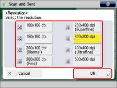 Press [Scan and Send] → specify the destination → press the resolution button.