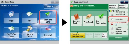 Press [Scan and Send] → specify the destination → press the scan size button.