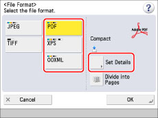 Select [PDF], [XPS], or [OOXML] → press [Set Details].