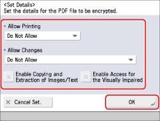 Select this key to set a password for printing or editing the scanned PDF. If you select this key, you can specify the settings such as <Allow Printing>, <Allow Changes>, and [Enable Accessibility, Copy, Extraction of Image/Text].