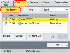 Displays detailed information for the selected job. Check the detailed information → press [OK] to return to the Send screen.