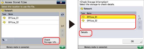 Press [Check Storage Info.] → select the desired storage location → press [Details].
