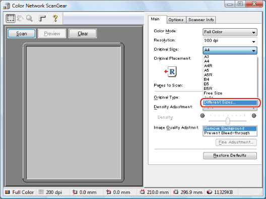 When scanning a non-standard size original, select [Free Size] or [Custom] from [Original Size].