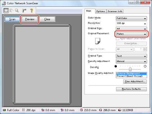 Select [Platen] for [Original Placement] → click [Preview].