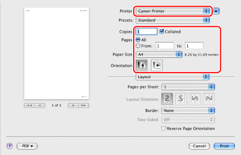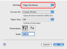 In Mac OS X 10.5 and later, the [Page Setup] dialog box may not be displayed, depending on the application you are using. If this is the case, skip to step 4. You can specify [Paper Size], [Orientation], and [Scale] in the [Print] dialog box.