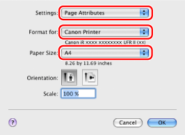 Select [Page Attributes] from [Settings] → select your printer from [Format for] → select a paper size for printing from [Paper Size].