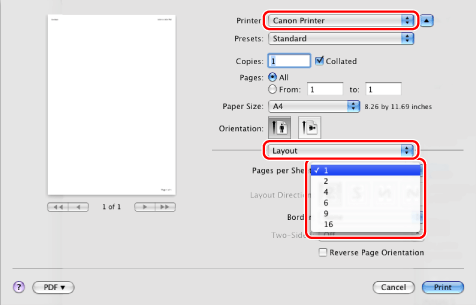 Select your printer → [Layout] →the number of pages you want to print onto one sheet of paper from [Pages per Sheet].