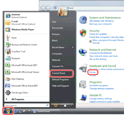 For Windows XP Home Edition, click [Start] → [Control Panel] → [Printers and Other Hardware] → [Printers and Faxes].