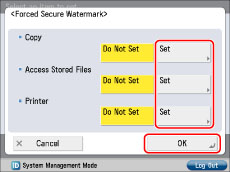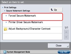 → [Function Settings] → [Common] → [Print Settings] → [Secure Watermark Settings] → [Forced Secure Watermark].