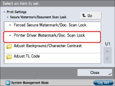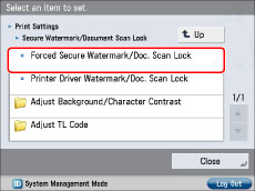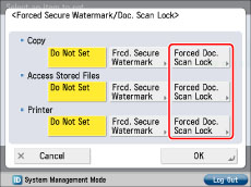 If the Secure Watermark is activated, press [Forced Doc. Scan Lock] for the function (<Copy>/<Access Stored Files>/<Printer>) to set the Forced Document Scan Lock mode.
