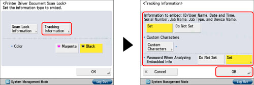 [Set] is set for <Password When Analyzing Embedded Info> in <Tracking Information> by default. The default password is '7654321'. We recommend that you change the password. If <Password When Analyzing Embedded Info> is [Set], password authentication is requested when analyzing the tracking information using the Document Scan Code Analyzer for MEAP. To strengthen the confidentiality of the information, we recommend that password authentication be set for analyzing the tracking information.
