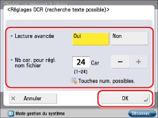 Appuyer sur [Oui] sous <Lecture avancée> → appuyer sur [-] ou [+] sous <Nbre caract. pour nom fichier OCR> pour définir le nombre de caractères du nom de fichier → appuyer sur [OK].
