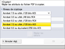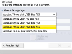 Si [Acrobat 10.0 ou équivalent] est sélectionné, [Acrobat 10.0 ou équivalent/256 bits AES] s'affiche lors de la sélection du niveau de cryptage.