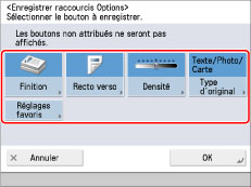 Il est possible de créer des raccourcis vers les fonctions les plus fréquemment utilisées sous [Options], dans l'écran Copie. En outre, il est possible de rappeler directement des boutons mémorisés sous [Réglages favoris].